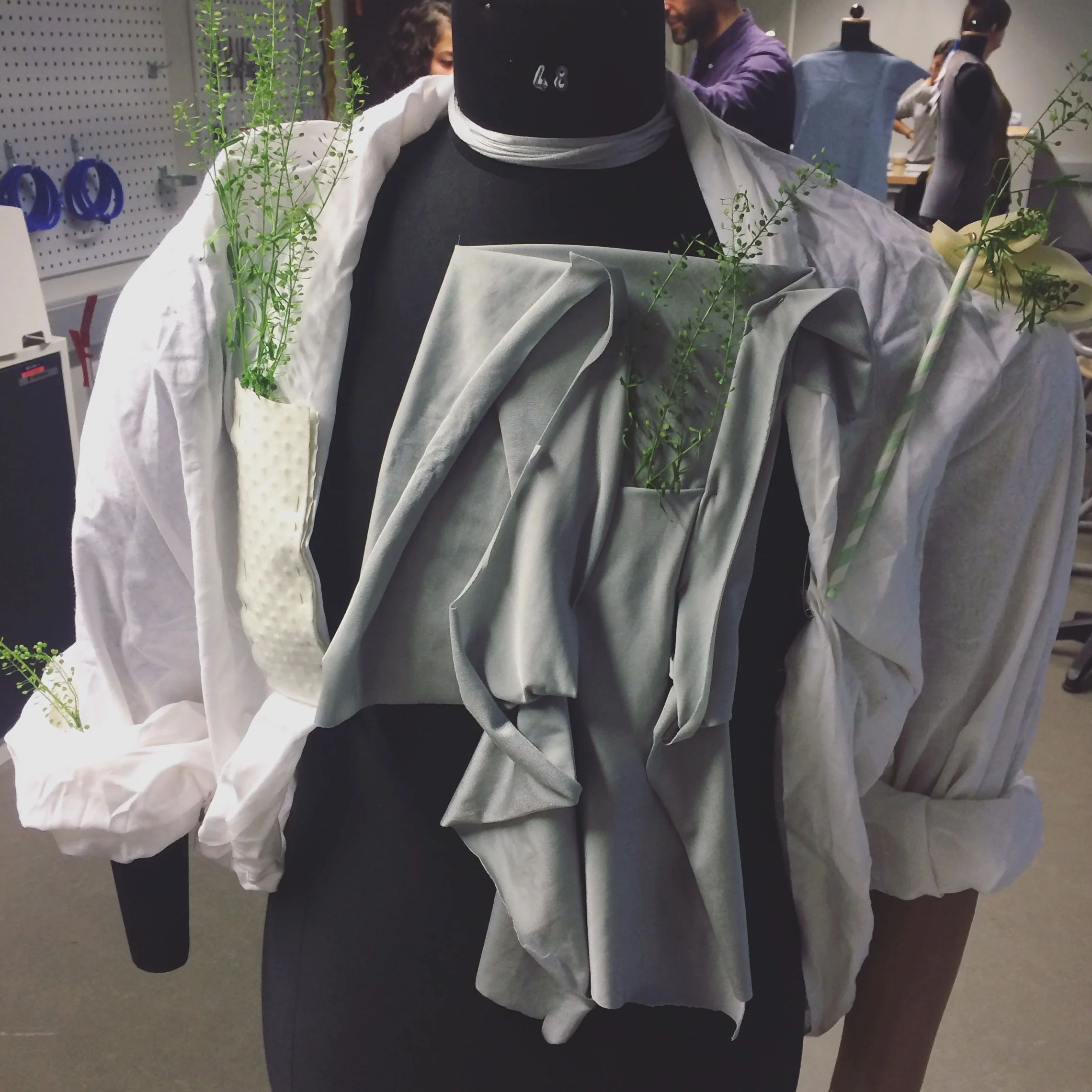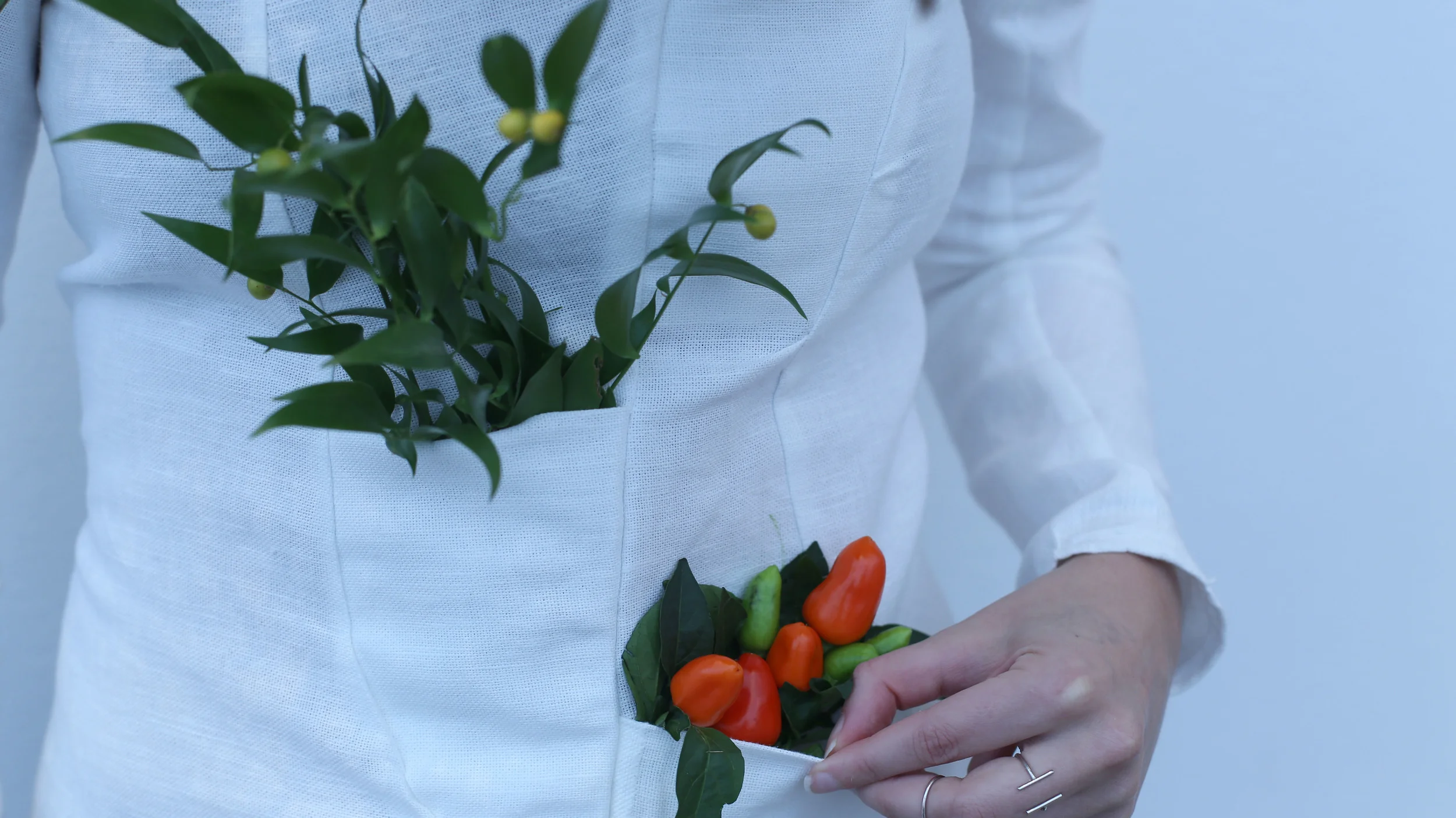 Long vertical pockets and curvy cuts inspired by roots and stems, seamlessly blending in.